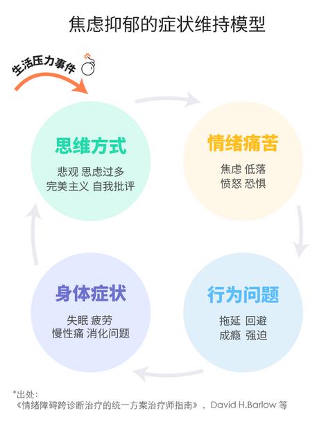 在臨床心理學(xué)家看來(lái),焦慮和抑郁情緒,是在壓力事件的觸發(fā)下,思維——情緒——行為——身體反應(yīng)之間互相作用的循環(huán)。而焦慮抑郁障礙的產(chǎn)生,意味著癥狀本身成為壓力源,帶動(dòng)了這個(gè)循環(huán)在外部壓力事件解除后,依舊持續(xù)運(yùn)轉(zhuǎn)。