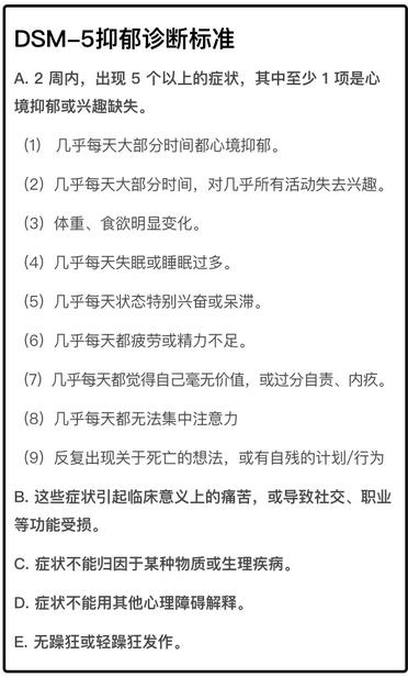 抑郁是一種低落、動(dòng)機(jī)缺乏(沒(méi)勁)、無(wú)意義感和疲憊的體驗(yàn)。通常伴隨「活著沒(méi)意義」或者「自己很差勁、沒(méi)有價(jià)值的」相關(guān)的想法。飲食和睡眠規(guī)律的變化(吃太多或太少,睡太多或太少),是抑郁發(fā)作的明顯信號(hào)。