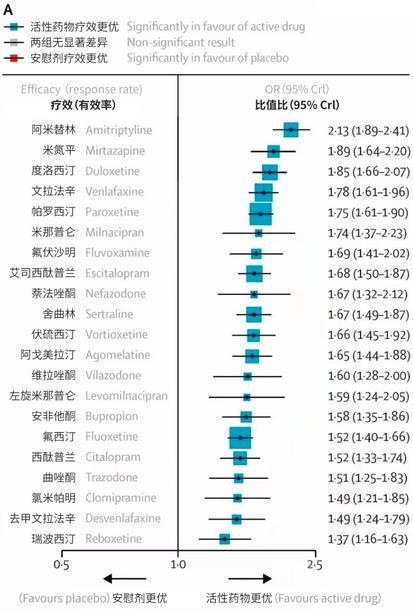 柳葉刀2018年的一篇重磅研究,發(fā)現(xiàn)21種抗抑郁藥物的療效均顯著高于安慰劑↓