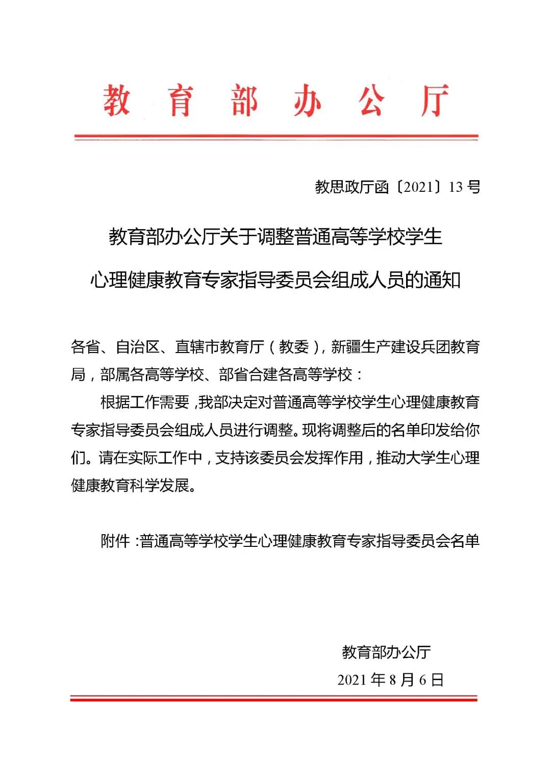 教育部辦公廳關(guān)于調(diào)整普通高等學(xué)校學(xué)生心理健康教育專家指導(dǎo)委員會(huì)組成人員的通知