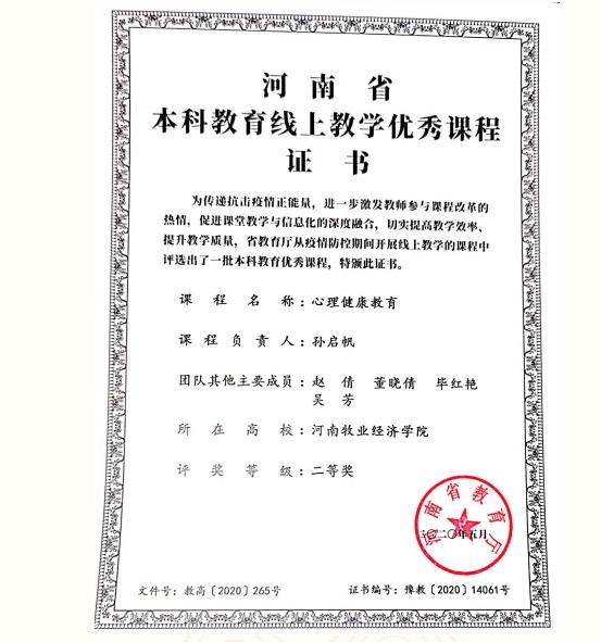 開(kāi)設(shè)《心理健康教育》必修課,匯集線上、線下優(yōu)質(zhì)資源,不斷完善課程體系,創(chuàng)新教學(xué)模式,培育學(xué)生自尊自信、理性平和、積極向上的心態(tài)。該課程還被評(píng)為2020年河南省本科教育線上教學(xué)優(yōu)秀課程二等獎(jiǎng)哦。
